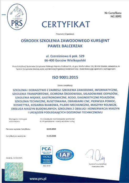 Jesteśmy Ośrodkiem szkoleniowym zajmującymi się kursami zawodowymi. Specjalizujemy się w kursach mających na celu zdobycie uprawnień, kwalifikacji oraz zaświadczeń do wykonywania zawodu. Prowadzimy szkolenia zarówno w siedzibie naszej firmy jak również w siedzibie zleceniodawcy na terenie miasta Gorzów Wlkp., i województwa lubuskiego. Rozwijamy się i prowadzimy także naszą działalność szkoleniową również na obszarze sąsiednich województw (zachodniopomorskie, wielkopolskie). W ofercie szkoleniowej mamy kursy: obsługa wózka jezdniowego, obsługa żurawi HDS, certyfikat kompetencji zawodowych dla przewoźników drogowych, operator koparko-ładowarki, operator koparki jednonaczyniowej, obsługa podestów ruchomych, kursy biurowe jak księgowo-kadrowy, płacowe, kurs komputerowy, ms excel itp.